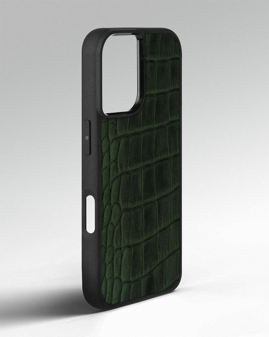 Чохол із темно-зеленого тиснення під крокодила на телячій шкірі для iPhone 16
