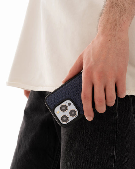 Чохол із темно-синьої шкіри пітона з дрібними лусочками для iPhone 15