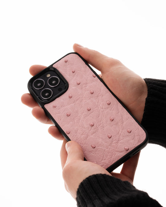 Pink ostrich leather case with follicles for iPhone 15 Pro