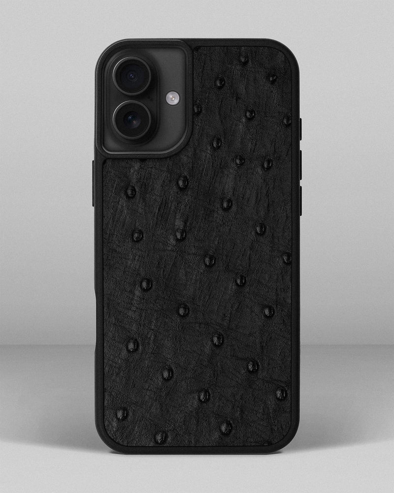 Чохол із чорної шкіри страуса з фолікулами для iPhone 16 Plus