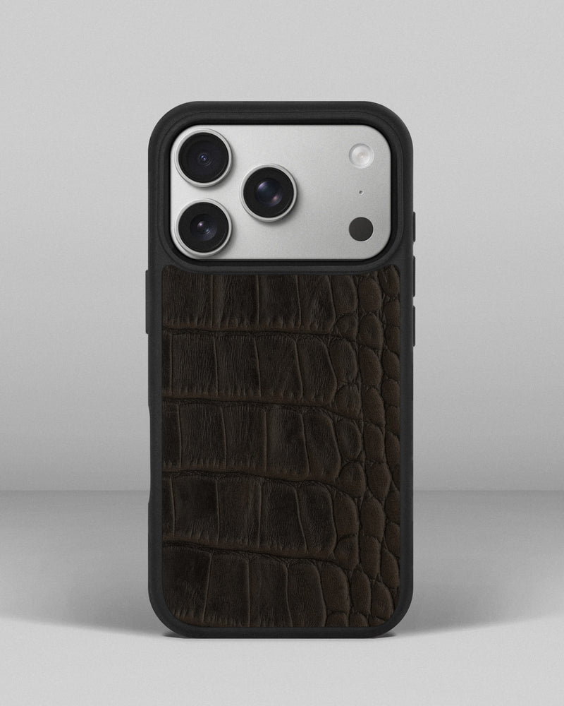 Чохол із темно-коричневого тиснення під крокодила на телячій шкірі для iPhone 17 Pro